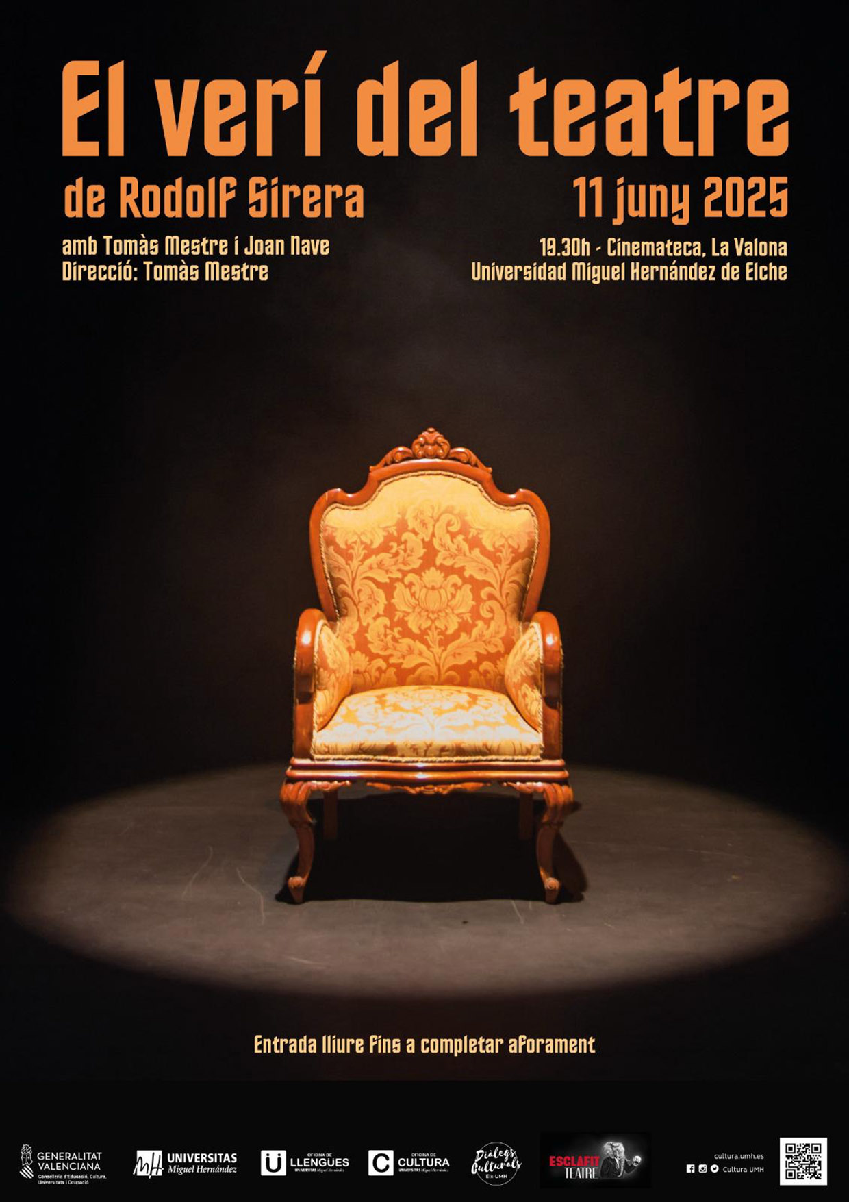 El Vicerectorat de Cultura, Igualtat i Diversitat de la UMH, dins del projecte Diàlegs culturals: Elx – UMH, organitza la representació de El verí del teatre, de Rodolf Sirera, a càrrec de la companyia Esclafit Teatre, amb Joan Nave i, el director, Tomàs Mestre.