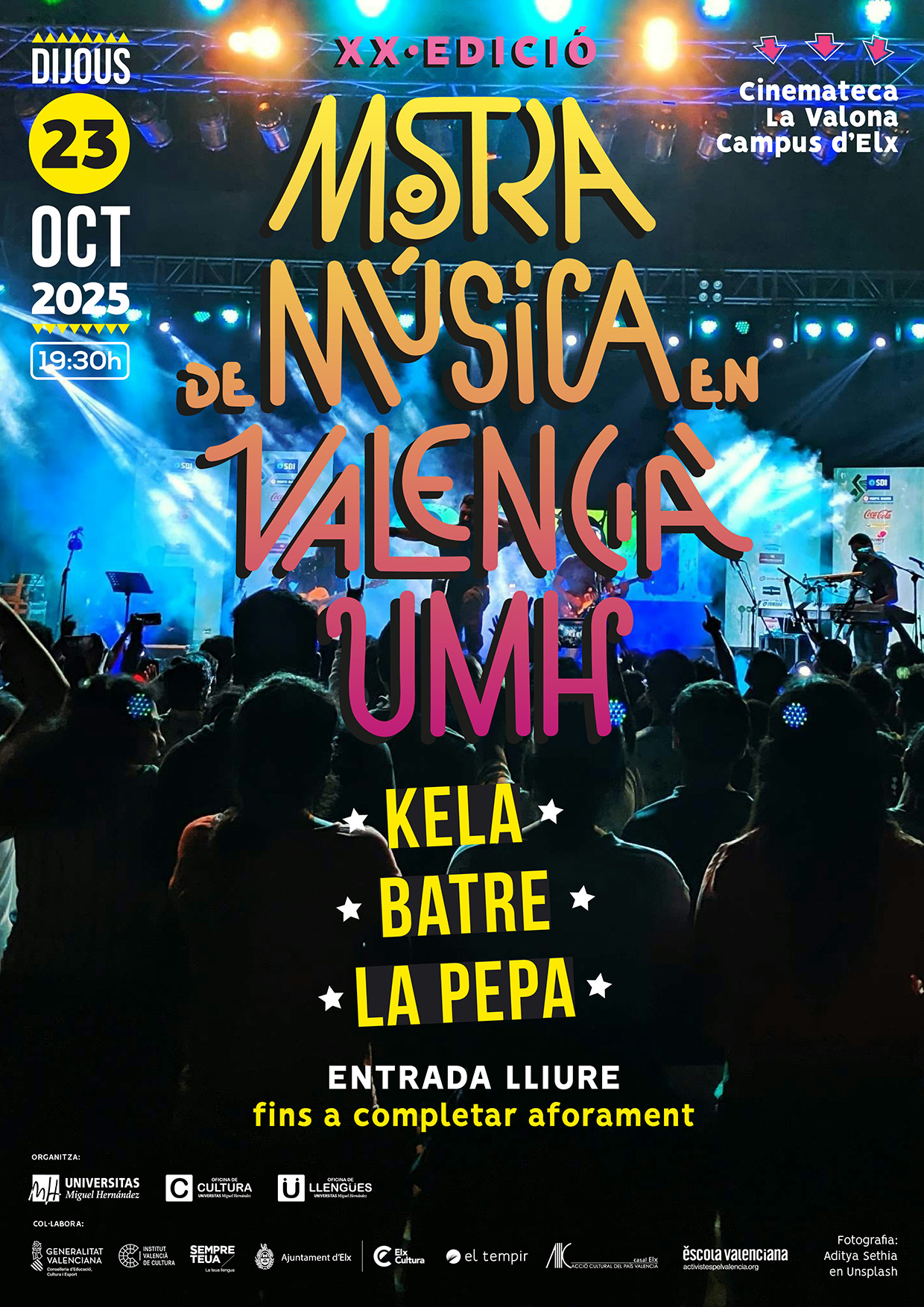 El Vicerectorat de Cultura, Igualtat i Diversitat organitza la XX Mostra de Música en Valencià. El proper dijous dia 23 d’octubre, a les 19:30 hores, a la Cinemateca de l’edifici La Valona del campus d’Elx.