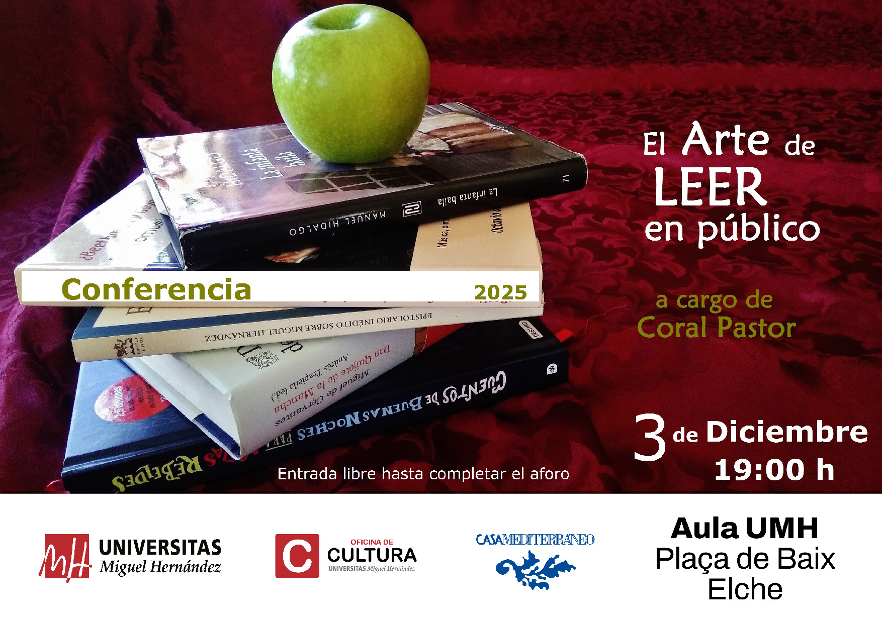 El Vicerectorat de Cultura, Igualtat i Diversitat, amb Casa Mediterráneo, organitzen la conferència L’art de llegir en públic, a càrrec de Coral Pastor, el pròxim dimecres 3 de desembre de 2025, a les 19.00 hores, a l’Aula UMH de la plaça de Baix.