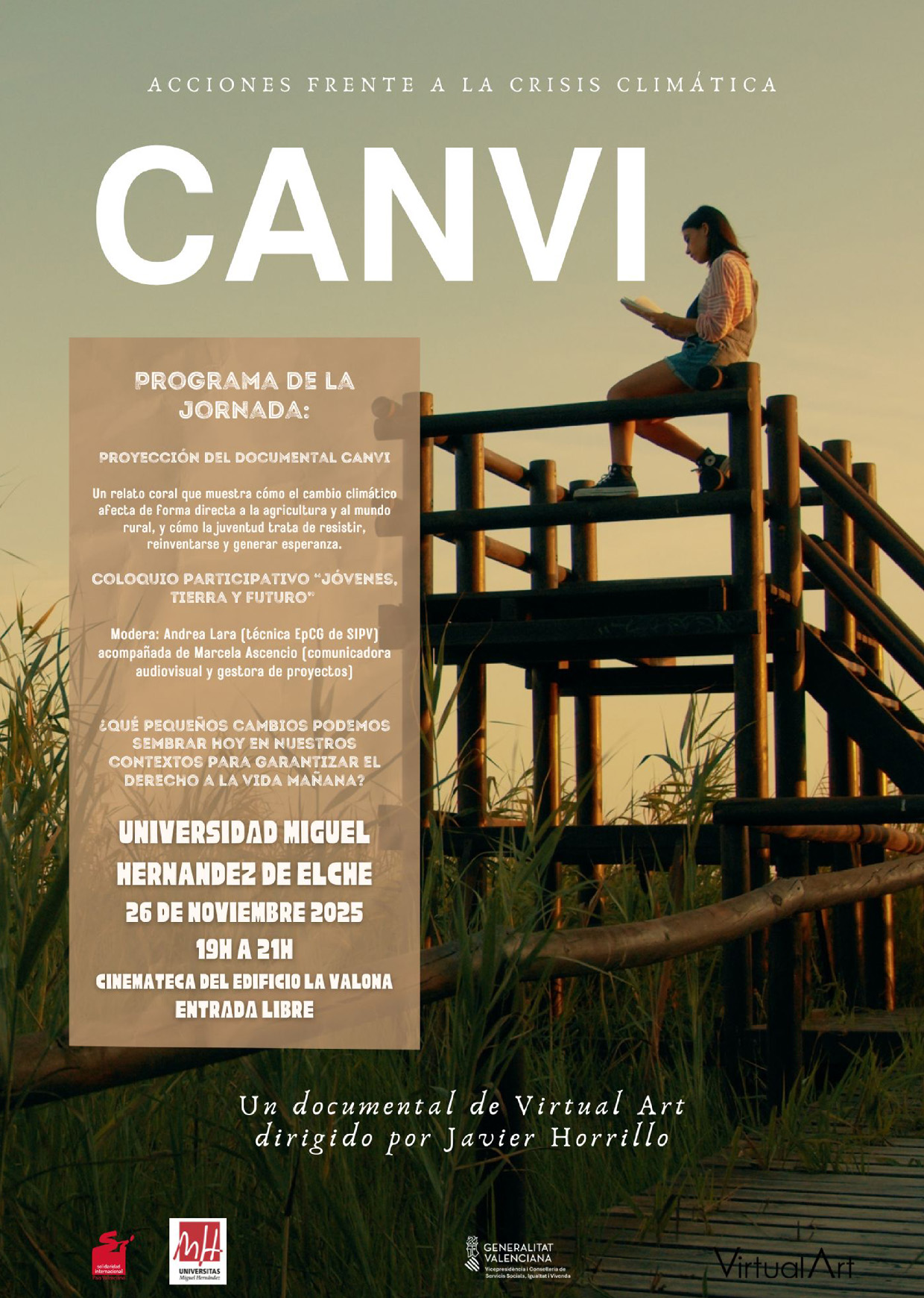 El Vicerectorat de Cultura, Igualtat i Diversitat de la Universitat Miguel Hernández d’Elx ha posat en marxa el Club Cine UMH, un lloc de trobada de persones especialistes en el sèptim art el proper dimecres, 26 de novembre, a les 19:00 hores, a la Cinemateca de l’edifici La Valona del campus d’Elx. En aquesta ocasió es presenta el documental Canvi, de Javier Horrillo.