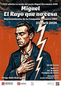La Companyia de teatre UMH, dirigida per Adán Rodríguez, representarà, en la benvinguda a senderistes de la XXX edició La senda del poeta Miguel Hernández 2026, l’obra teatral Miguel. El raig que no cessa (representació en castellà). El dissabte 25 d’abril 2026, a les 20.30 hores, a l’Aula 1.1 de l’edifici Arenals de campus d’Elx.