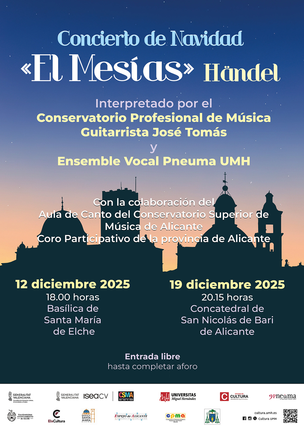 El Conservatorio Profesional de Música Guitarrista José Tomás junto al Ensemble Vocal Pneuma UMH y con la colaboración del Aula de Canto del Conservatorio Superior de Música de Alicante Coro Participativo de la provincia de Alicante celebra un doble concierto de Navidad títulado El Mesías, de Händel. El viernes 12, a las 18.00 horas, en la Basílica de Santa María de Elche; y viernes 19, a las 20.15 horas, en la Concatedral de San Nicolás de Bari de Alicante.