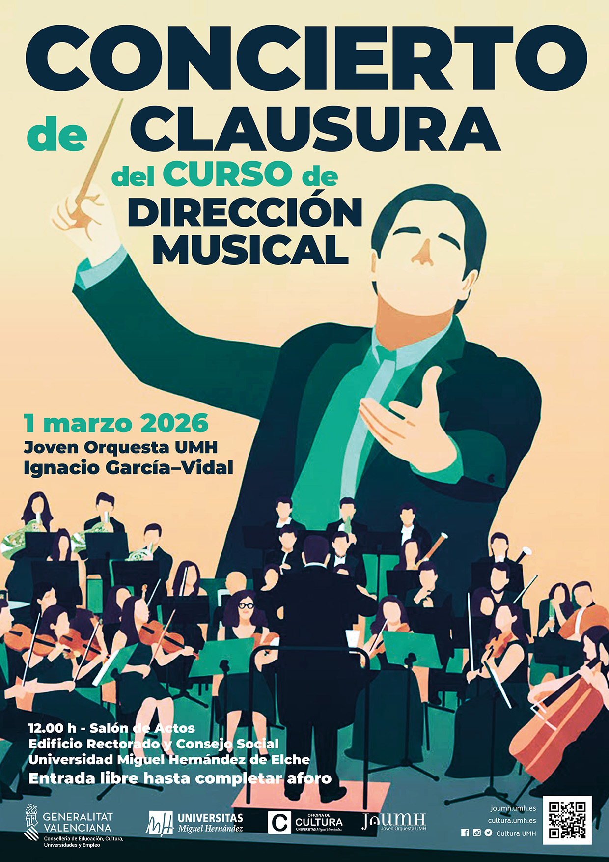 El próximo domingo 1 de marzo, tendrá lugar el concierto que clausura la 3.ª edición del curso de invierno Dirección Musical del Vicerrectorado de Cultura, Igualdad y Diversidad UMH, impartido por el maestro Ignacio García-Vidal con la participación de la Joven Orquesta UMH (JOUMH), bajo la dirección de Francisco Serra. Será en el Salón de Actos del edificio Rectorado y Consejo Social a las 12:00 horas.